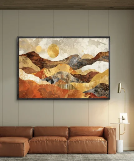 Ce tableau abstrait aux tons chauds de beige, ocre et doré évoque les dunes dorées d’un désert baigné de lumière.