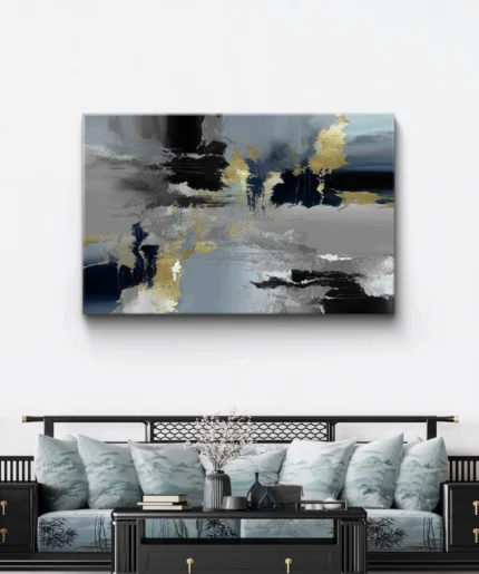 “Orage Silencieux” est une œuvre d’art abstraite puissante et sophistiquée, mêlant des teintes de noir, gris, bleu profond et des