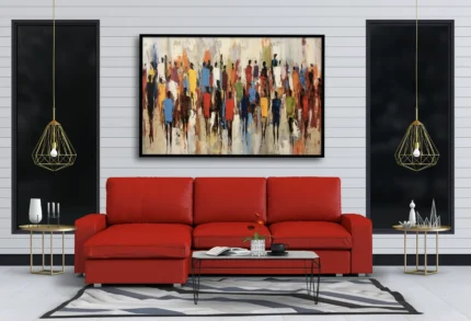 “La Marche des Couleurs” est une œuvre expressive et pleine de mouvement, représentant une foule de silhouettes humaines aux vêtements