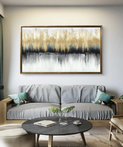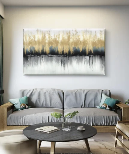 Reflets Dorés est une œuvre abstraite contemporaine qui joue avec les textures et les contrastes. Les touches dorées vibrantes s’élèvent