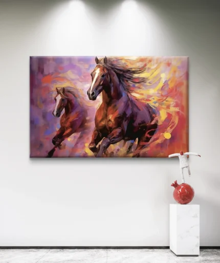 l’élégance de deux chevaux lancés à pleine vitesse. Le fond, baigné de nuances chaudes — rouge, orange, et violet —