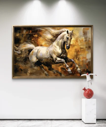 Plongez dans la puissance et la liberté avec Élan Sauvage, une œuvre d’art vibrante représentant un cheval majestueux lancé à