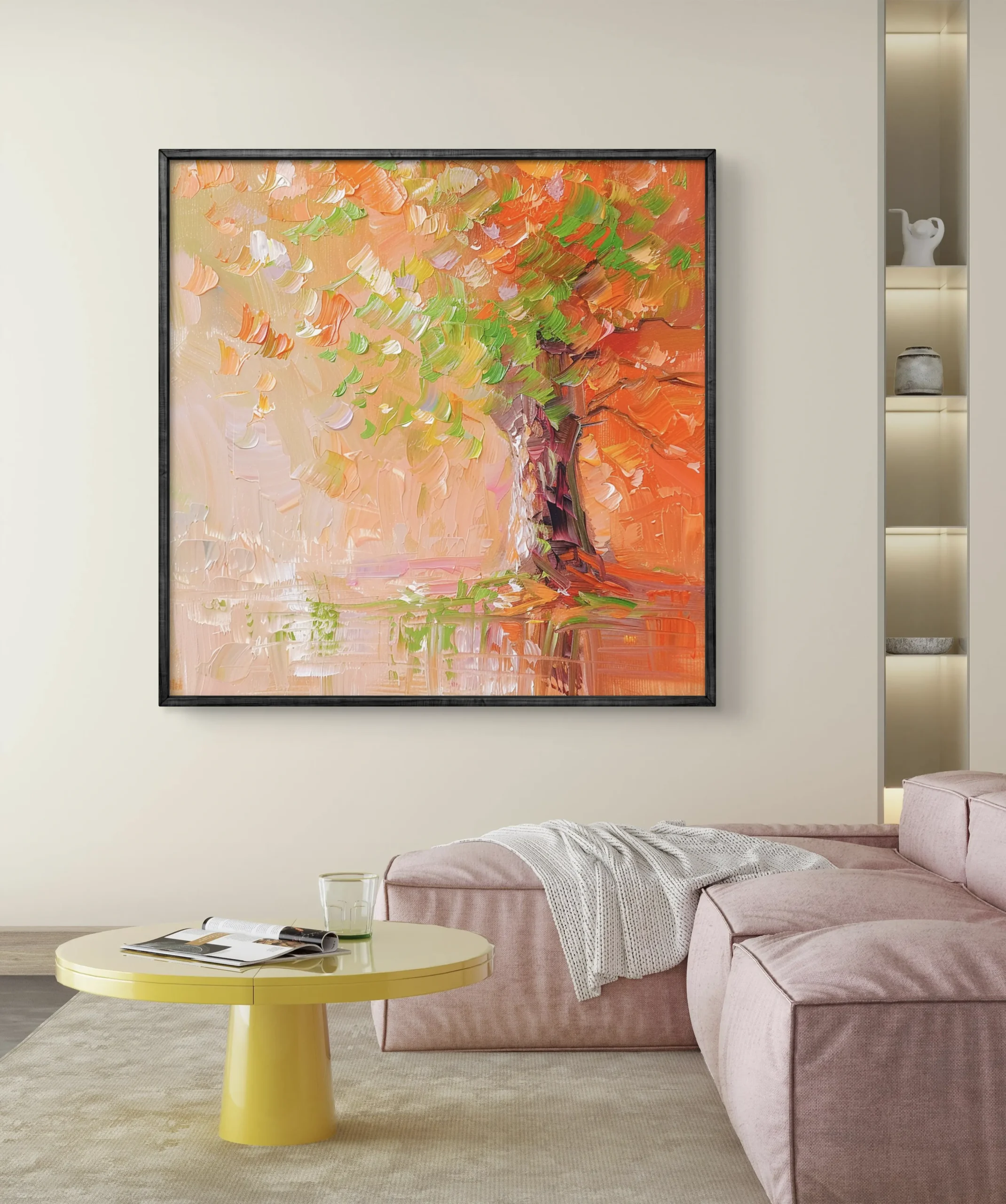 Un arbre majestueux peint à larges coups de pinceau, mêlant des teintes chaudes d’orange et de rose, contrastées par des touches de vert vif. Cette œuvre abstraite évoque la douceur d’un coucher de soleil et apporte une touche vibrante et moderne à tout intérieur.