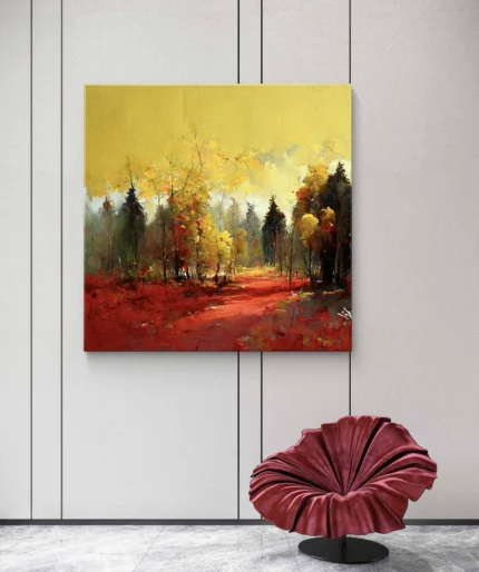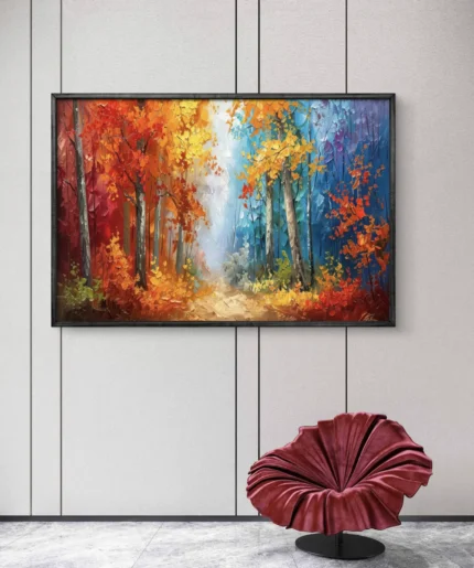 Plongez au cœur d’une forêt baignée de lumière dorée, où les arbres flamboyants aux teintes jaunes et rouges créent un