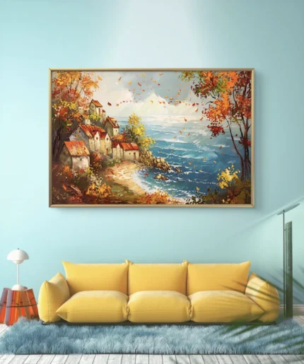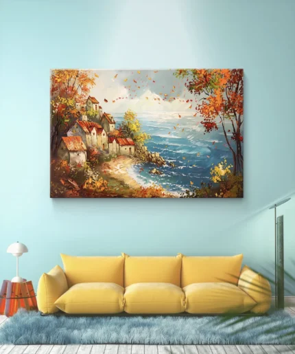Plongez dans la douceur d’un village pittoresque niché au bord de la mer, entouré de couleurs chaudes d’automne et caressé