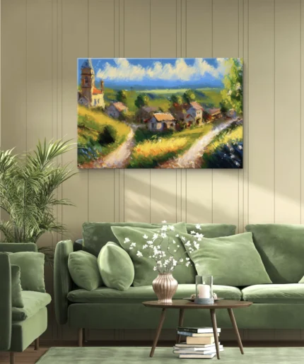 Été au Village capture toute la douceur et la chaleur d’une journée d’été à la campagne. Ce tableau lumineux et