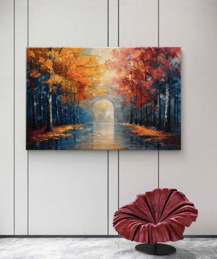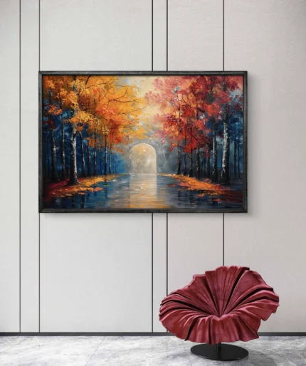 “Passage d’Automne” est une peinture à l’huile vibrante et immersive qui transporte le spectateur au cœur d’une forêt enchantée. Les