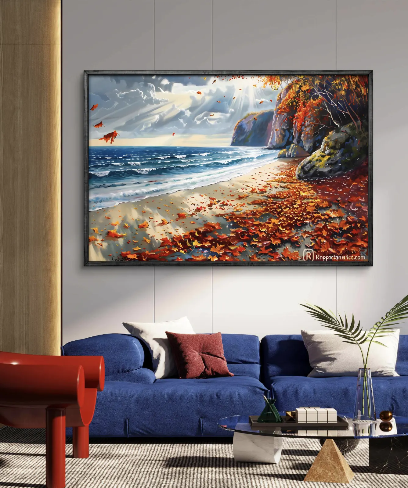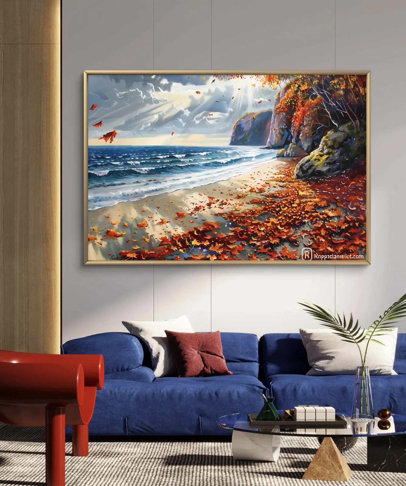 Laissez-vous emporter par la douceur d’Automne sur la Côte, une œuvre poétique où les feuilles rousses dansent avec le vent au bord d’une mer paisible. Entre la lumière dorée du soleil filtrant à travers les nuages et les falaises majestueuses en arrière-plan, cette peinture mêle la chaleur de l’automne à la fraîcheur marine. Une scène idéale pour apporter sérénité, élégance et profondeur à votre espace intérieur.