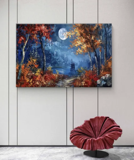 Un sentier mystérieux sous la lumière d’une pleine lune éclaire une forêt flamboyante aux couleurs d’automne. Cette œuvre évoque la