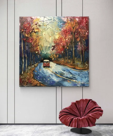 Une route sinueuse peinte avec des teintes vibrantes de bleu et d’or, bordée d’arbres flamboyants aux couleurs automnales. Au centre,