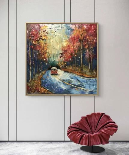 “Chemin vers le Lac” est une peinture à l’huile apaisante qui dépeint un sentier forestier bordé d’arbres aux couleurs automnales,