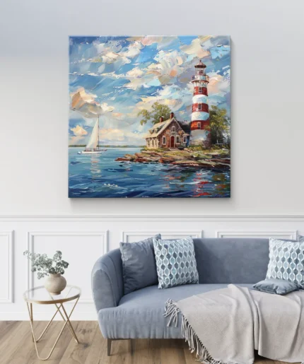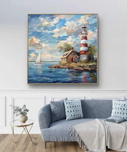 “Lumière du Rivage” est une ode à la sérénité des côtes et au charme intemporel des phares guidant les navigateurs.