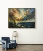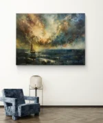 Laissez-vous emporter par la puissance évocatrice de “Cap Vers l’Inconnu”, une toile majestueuse où un voilier solitaire brave les vagues tumultueuses sous un ciel dramatique. Le jeu d’ombres et de lumières, rehaussé de touches dorées subtiles, crée une ambiance à la fois mystérieuse et inspirante.
