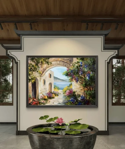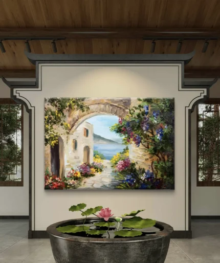 Un tableau artistique éclatant qui capture la beauté d’un passage méditerranéen fleuri, ouvert sur une vue apaisante de la mer.