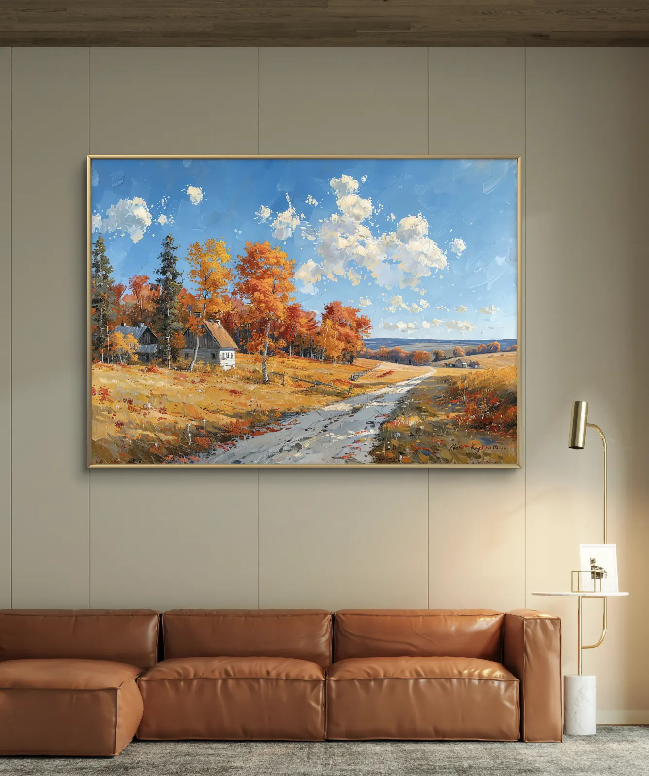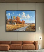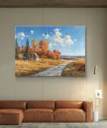 Plongez dans la chaleur d’un paysage automnal vibrant, où un chemin sinueux traverse des champs dorés parsemés d’arbres flamboyants aux teintes rouges et orangées. À l’horizon, de charmantes maisons rurales se nichent sous un ciel bleu parsemé de nuages cotonneux. Cette œuvre capture à merveille la sérénité et la beauté simple de la campagne en automne, invitant à l’évasion et à la contemplation.