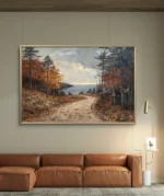 “Chemin vers le Lac” est une peinture à l’huile apaisante qui dépeint un sentier forestier bordé d’arbres aux couleurs automnales, menant doucement vers un lac scintillant à l’horizon. Le ciel légèrement nuageux laisse filtrer une lumière douce qui enveloppe la scène d’une atmosphère paisible et nostalgique. Les feuilles tombées et les tons chauds de la nature évoquent la tranquillité d’une promenade en fin d’après-midi.