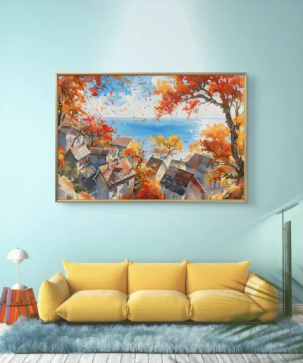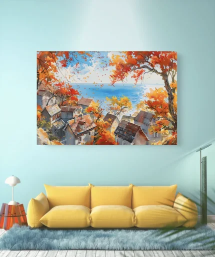 Un panorama chaleureux d’un village aux toits patinés, enlacé par la flamboyance des feuilles d’automne et surplombant une mer paisible.
