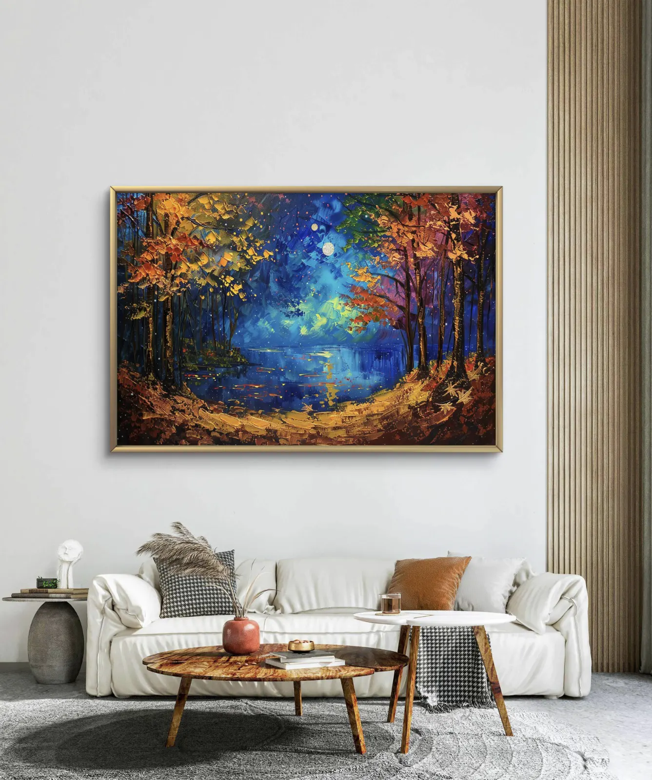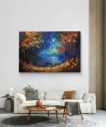 Clair de Lune en Forêt est une œuvre poétique aux couleurs vibrantes et contrastées. Ce tableau nous transporte dans une forêt enchantée, éclairée par la lumière douce de la lune. Les arbres aux feuillages automnaux encadrent un lac tranquille qui reflète le ciel étoilé. Avec ses touches épaisses et ses tons profonds — bleu, or, orange et pourpre —, cette peinture évoque la magie de la nature la nuit. Parfaite pour créer une ambiance apaisante et mystérieuse dans votre espace de vie.
