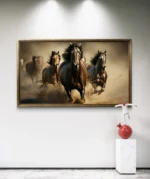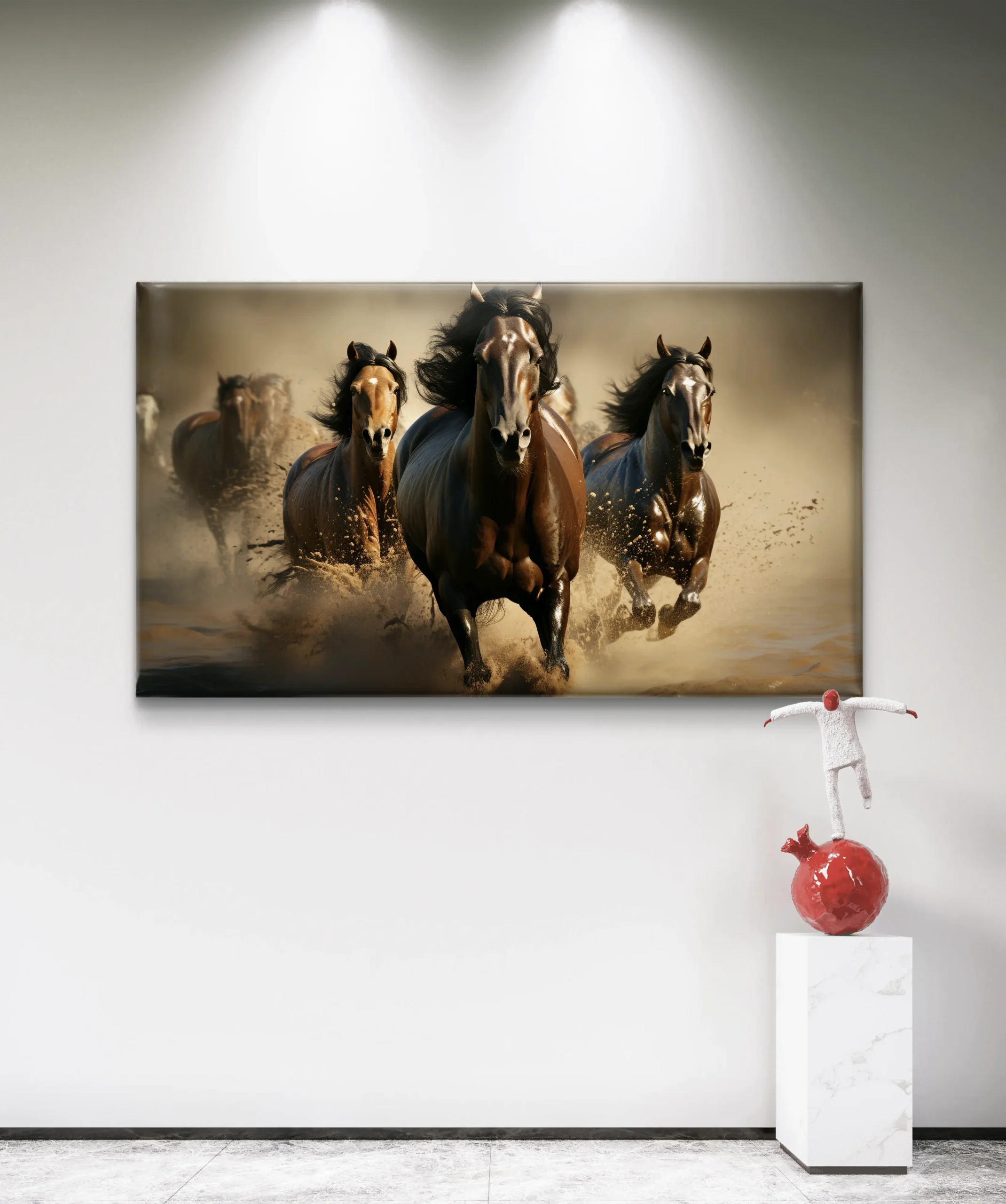Course Sauvage capture l’intensité brute et la beauté majestueuse d’un troupeau de chevaux lancés à pleine vitesse à travers l’eau et la poussière. L’effet photographique saisissant donne vie à la scène, mettant en valeur la puissance musculaire, l’énergie débordante et l’harmonie du mouvement. Ce tableau est une ode à la liberté et à la nature indomptée, idéal pour apporter force et dynamisme à votre espace intérieur.