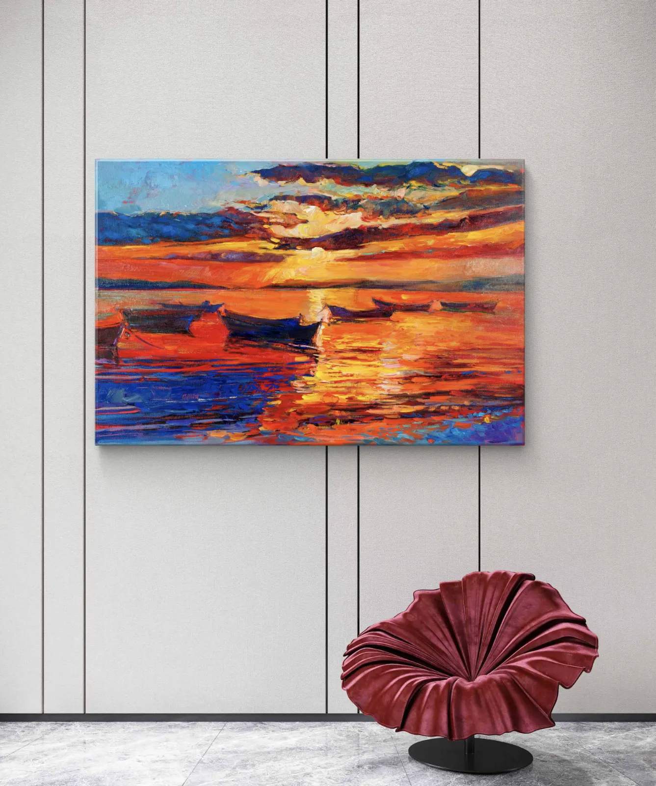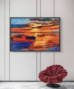 Plongez dans l’intensité vibrante de Crépuscule en Feu, une œuvre captivante peinte dans un style impressionniste moderne. Ce tableau représente une scène de coucher de soleil flamboyant, où les couleurs chaudes — orange, rouge, jaune — se mêlent aux reflets bleus du ciel et de la mer. Les bateaux flottent paisiblement, baignés dans la lumière dorée, créant une atmosphère à la fois apaisante et énergique. Une pièce idéale pour apporter chaleur et dynamisme à tout intérieur contemporain.