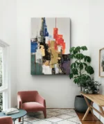 Un tableau éclatant qui capture l’énergie vibrante d’une ville moderne à travers une explosion de couleurs vives et de textures