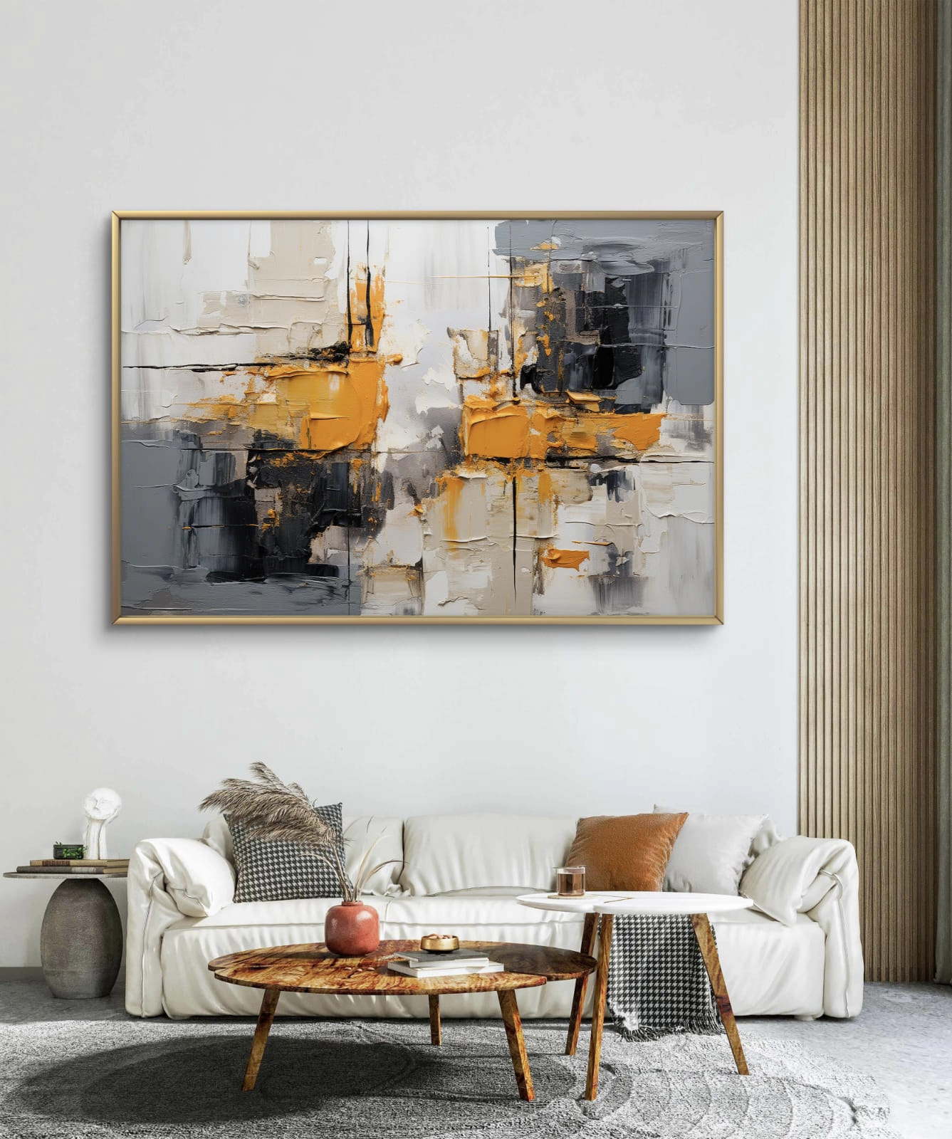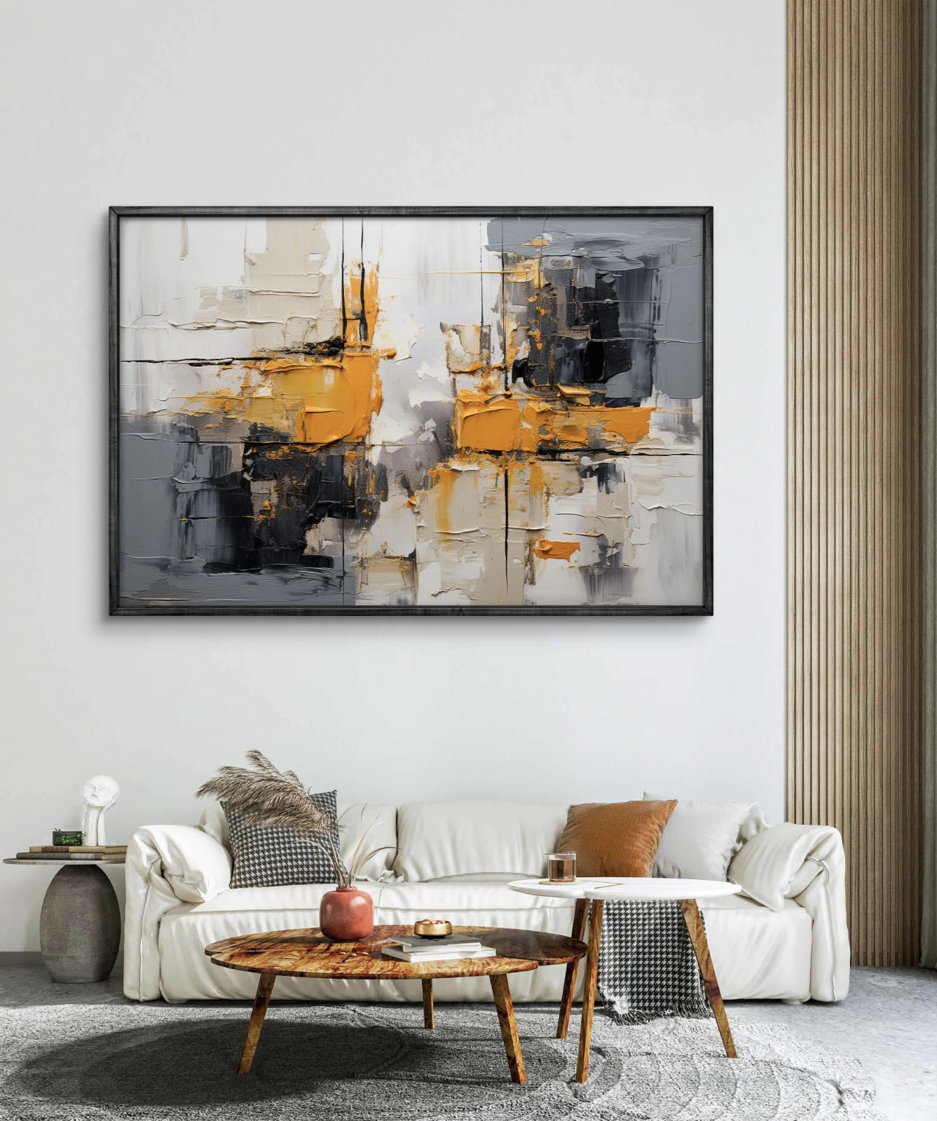 Ce tableau contemporain, à la fois sobre et raffiné, s’intègre facilement dans tout type d’intérieur — moderne, minimaliste ou industriel. Il apporte une touche d’élégance et de chaleur, idéale pour un salon, un bureau ou une chambre.