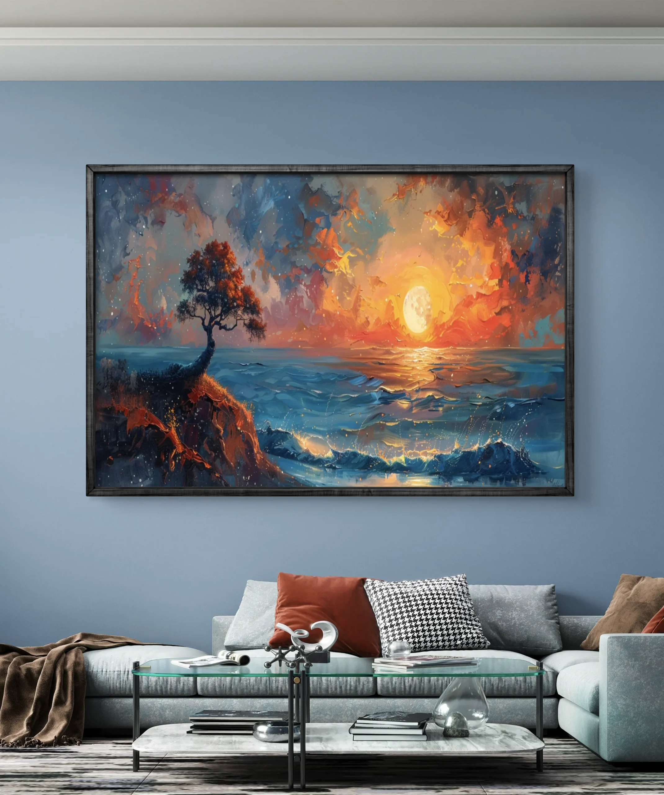 Plongez dans la magie d’un coucher de soleil flamboyant où le ciel embrase la mer. Cette œuvre captivante, mêlant couleurs chaudes et reflets marins, apporte chaleur et profondeur à votre intérieur. Un arbre solitaire se dresse sur une falaise, symbole de force et de sérénité face à l’immensité de l’océan.