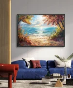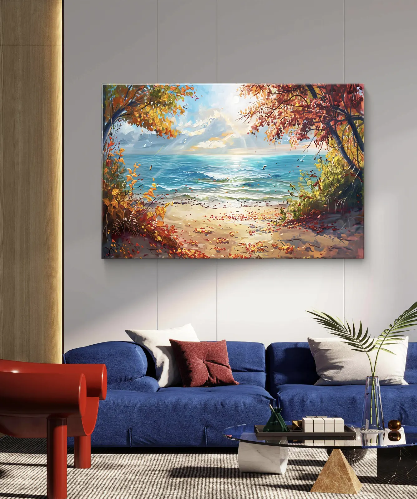 Un paysage apaisant où la plage se mêle aux couleurs chaudes de l’automne. Ce tableau capture la beauté de l’horizon marin éclairé par les rayons du soleil, offrant une sensation de liberté et de sérénité. Parfait pour apporter une touche lumineuse et relaxante à votre intérieur.