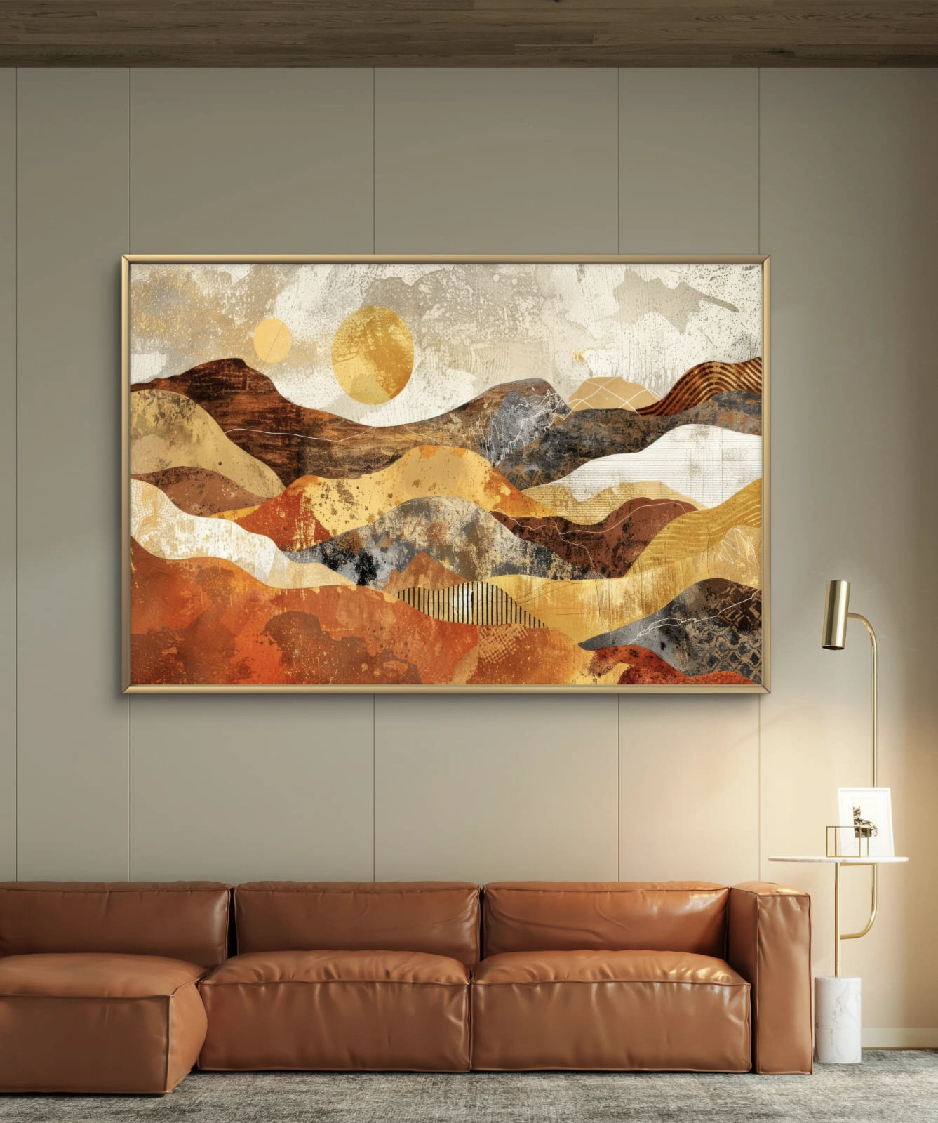 Ce tableau abstrait aux tons chauds de beige, ocre et doré évoque les dunes dorées d’un désert baigné de lumière. Les formes fluides et les textures riches créent une impression de profondeur et de sérénité. Parfait pour un salon moderne ou un espace de détente, ce tableau apporte une touche de chaleur et d’élégance naturelle à votre intérieur.