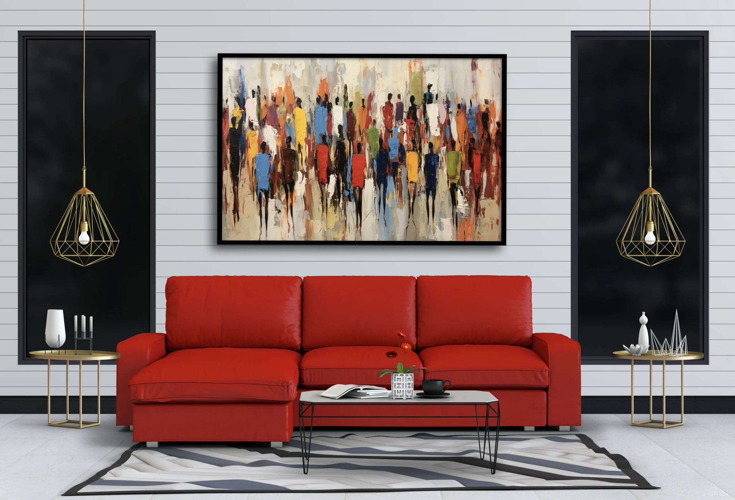 “La Marche des Couleurs” est une œuvre expressive et pleine de mouvement, représentant une foule de silhouettes humaines aux vêtements colorés, marchant dans une même direction. Chaque touche de pinceau énergique donne vie à cette scène urbaine animée, symbolisant la diversité, la solidarité et l’élan collectif. Avec sa palette vive de rouges, bleus, jaunes et verts sur fond neutre, cette toile abstraite apporte chaleur, dynamisme et profondeur à tout intérieur moderne.