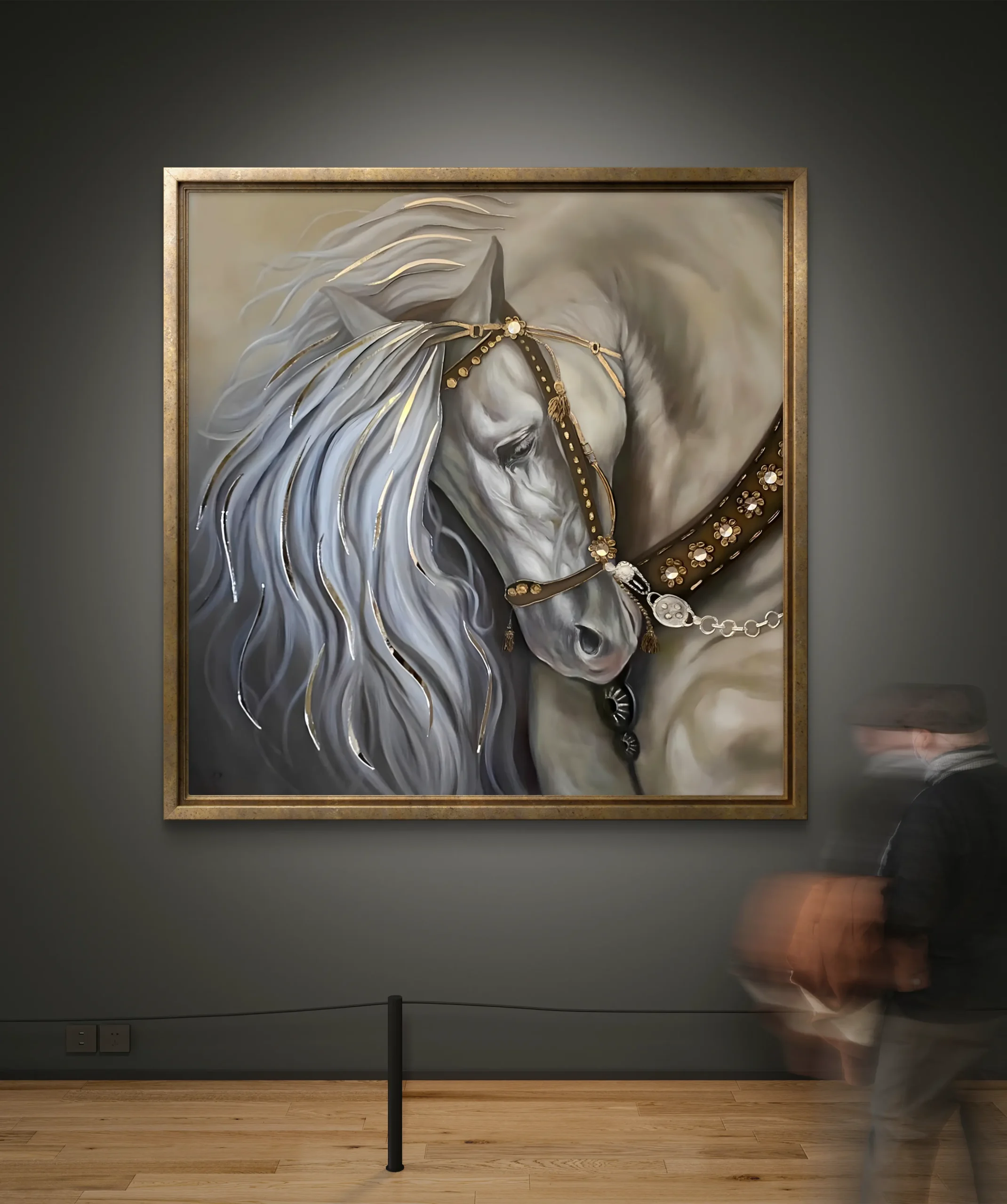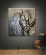 Un tableau raffiné représentant un majestueux cheval blanc orné de détails dorés et d’un harnais élégant. La douceur de ses traits et la brillance subtile de sa crinière symbolisent la force, la grâce et la noblesse. Une œuvre idéale pour apporter une touche de prestige et d’élégance intemporelle à votre intérieur.