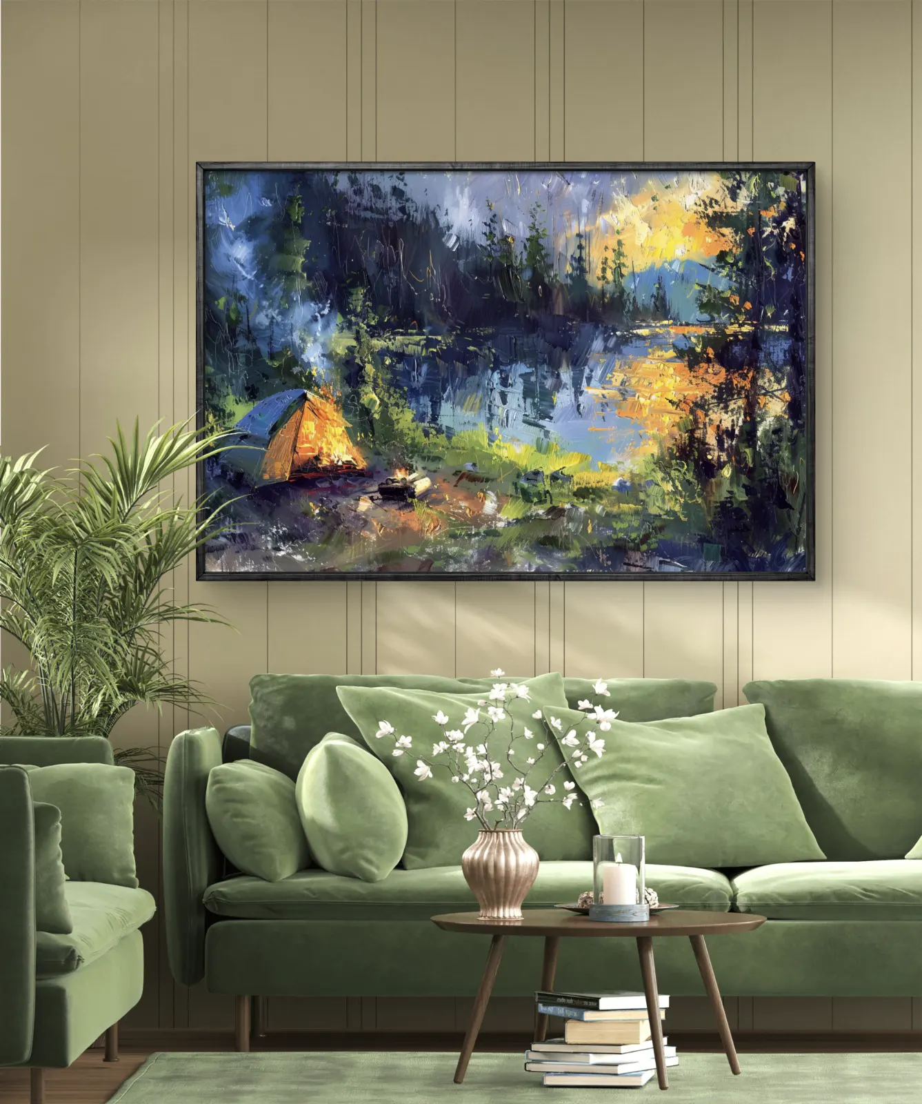 Un tableau vibrant qui nous transporte au cœur d’une nuit paisible en pleine nature. Une tente illuminée et un feu de camp crépitant reflètent leur lumière chaleureuse sur les rives calmes d’un lac, sous un ciel crépusculaire teinté d’orangé et de bleu profond. Cette scène évoque l’aventure, la liberté et la sérénité d’une soirée en camping, idéale pour insuffler une atmosphère conviviale et apaisante à votre intérieur.