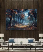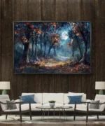Ce tableau immersif dévoile un sentier forestier éclairé par une pleine lune brillante, entouré d’arbres majestueux aux feuilles rousses et dorées. L’ambiance est à la fois paisible et mystérieuse, capturant la magie d’une nuit d’automne en pleine nature. Une pièce idéale pour instaurer une atmosphère douce et contemplative dans votre espace.