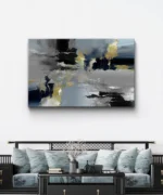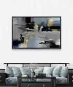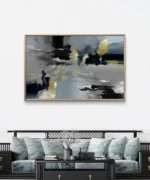 “Orage Silencieux” est une œuvre d’art abstraite puissante et sophistiquée, mêlant des teintes de noir, gris, bleu profond et des éclats dorés texturés. Elle évoque une tempête figée dans le temps, un chaos maîtrisé, où les contrastes d’ombre et de lumière se rencontrent avec élégance.