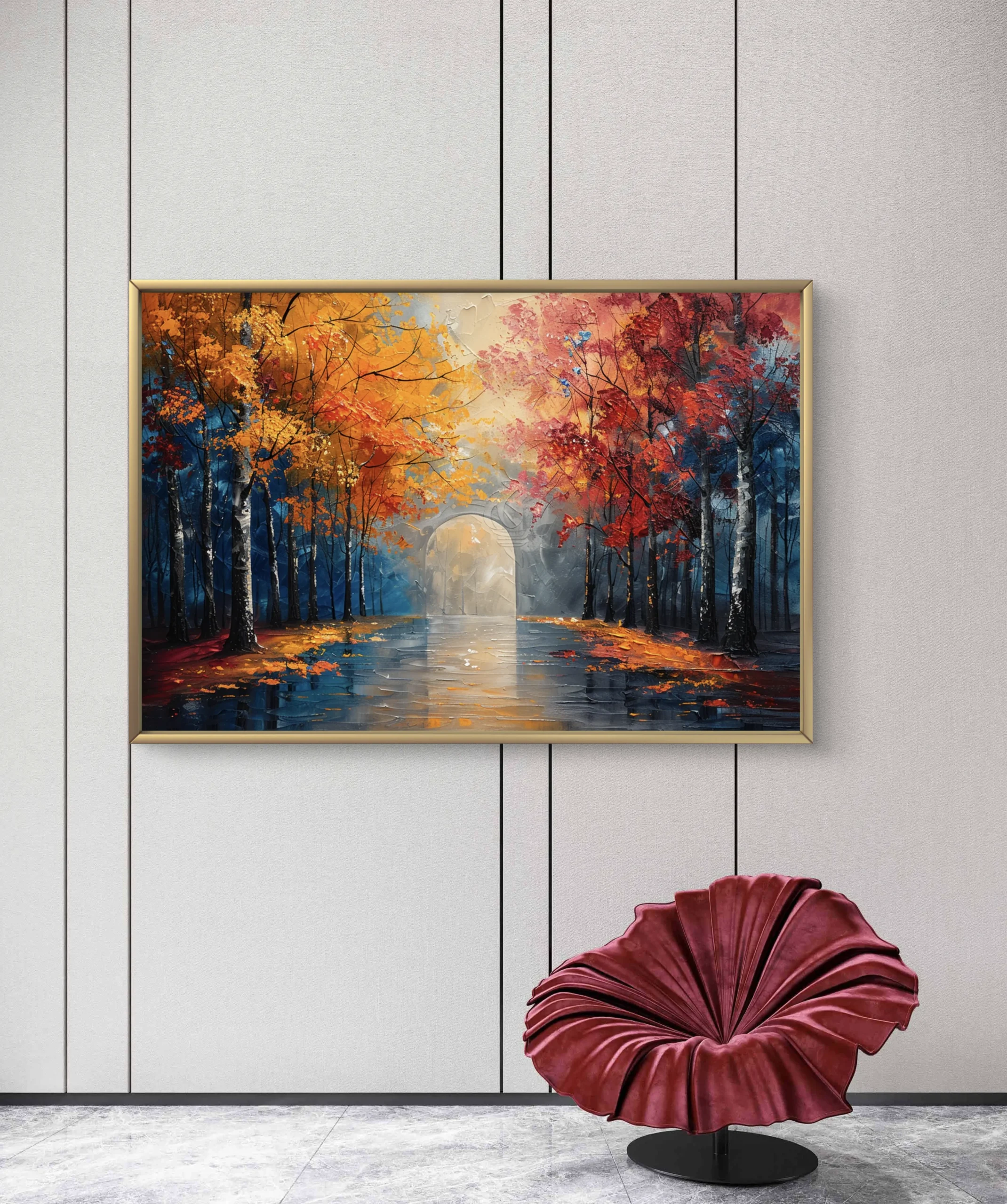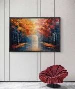 “Passage d’Automne” est une peinture à l’huile vibrante et immersive qui transporte le spectateur au cœur d’une forêt enchantée. Les arbres aux feuillages rougeoyants et dorés forment une allée lumineuse, menant vers une arche mystérieuse baignée de lumière. Le sol mouillé reflète les couleurs chaudes des feuilles d’automne, créant un jeu de reflets féérique.