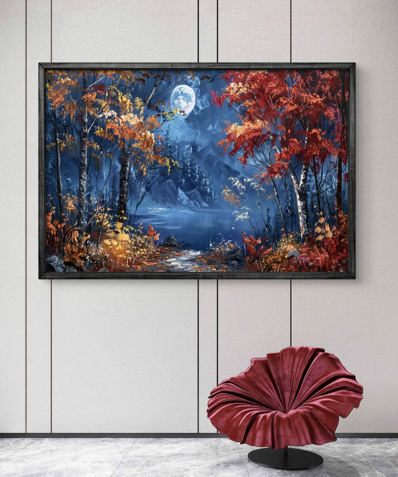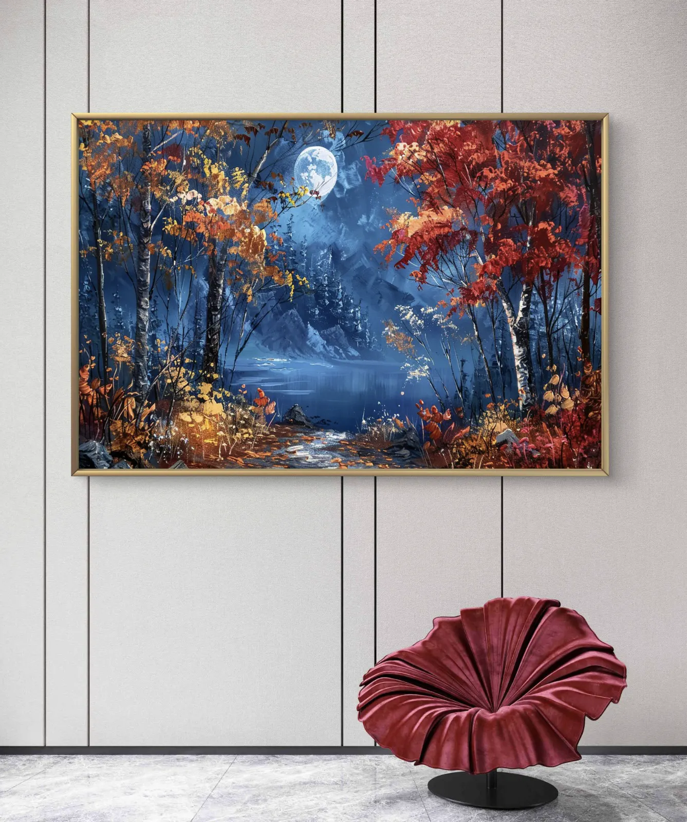 Ce tableau envoûtant illustre un paysage d’automne féerique, dominé par une pleine lune éclatante qui se reflète doucement sur un lac calme. Les arbres aux feuilles rouges et dorées encadrent un sentier menant vers l’eau, tandis que les montagnes en arrière-plan ajoutent profondeur et mystère à la scène. L’ambiance nocturne contraste magnifiquement avec les couleurs chaudes de la végétation, créant une œuvre puissante et apaisante à la fois.