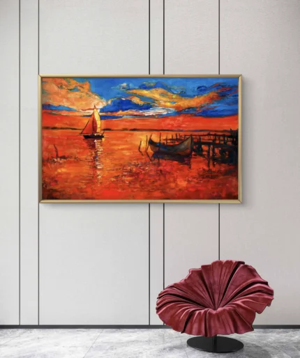 Plongez dans la magie d’un coucher de soleil flamboyant avec Crépuscule en Feu, une œuvre vibrante aux couleurs intenses. Cette