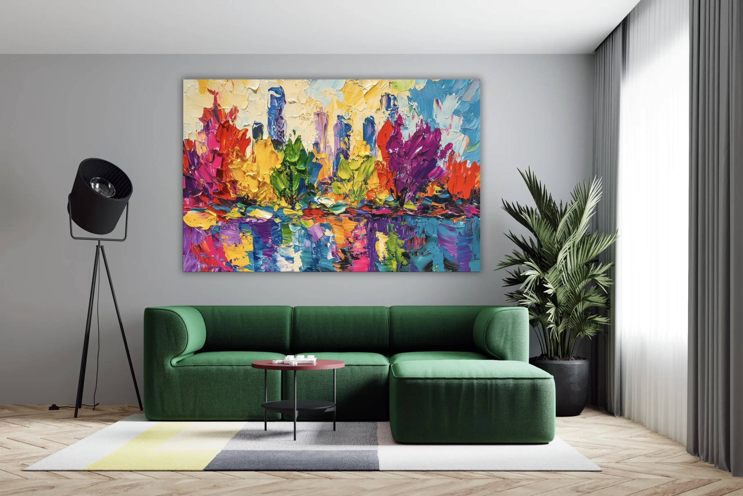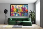 Un tableau éclatant qui capture l’énergie vibrante d’une ville moderne à travers une explosion de couleurs vives et de textures généreuses. Les touches audacieuses de rouge, jaune, vert et bleu se mêlent pour refléter une skyline abstraite sur l’eau, apportant une touche contemporaine et joyeuse à tout espace de vie.