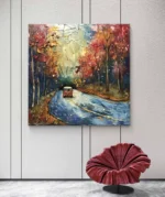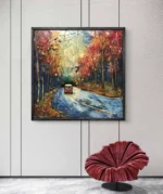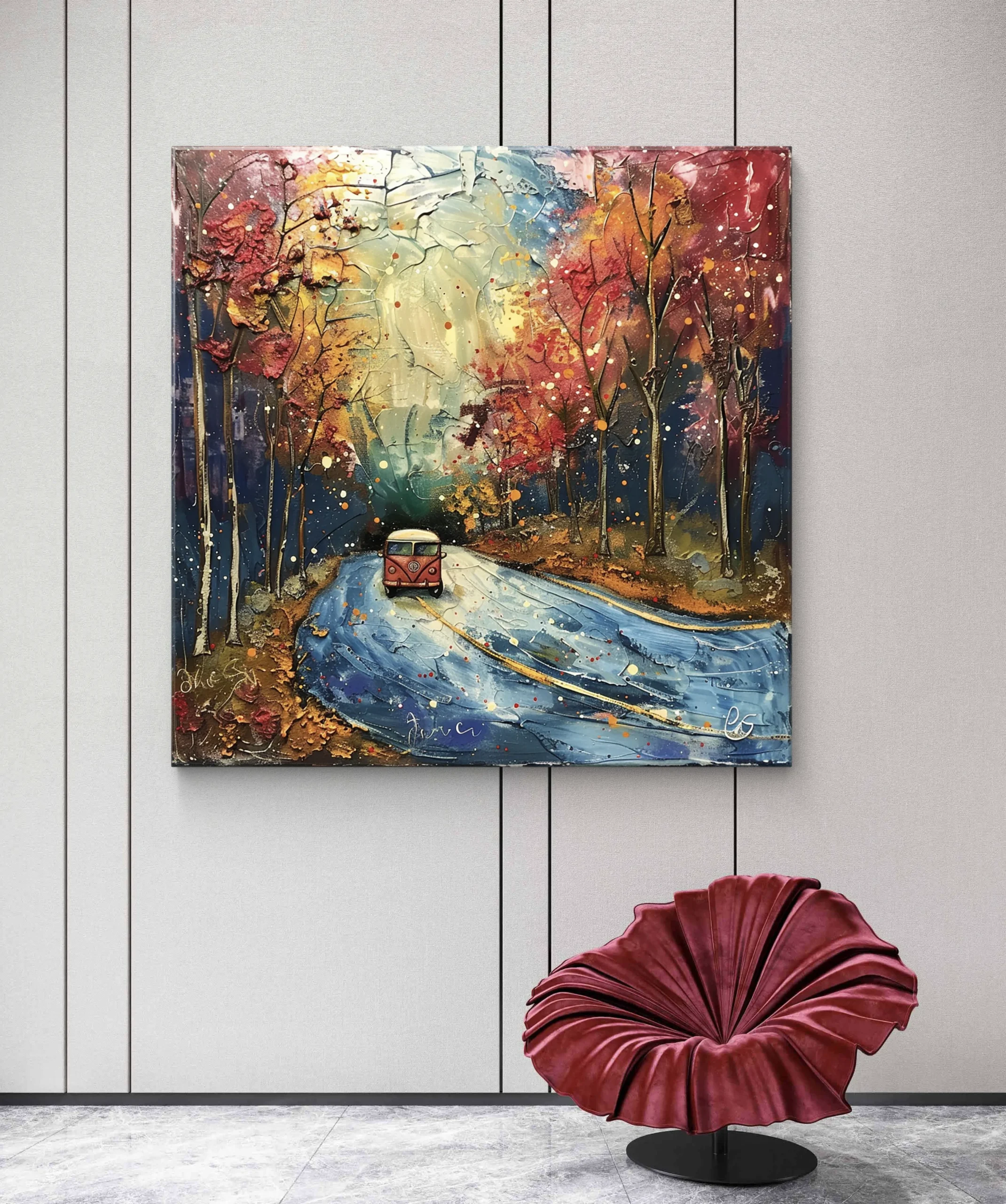 Une route sinueuse peinte avec des teintes vibrantes de bleu et d’or, bordée d’arbres flamboyants aux couleurs automnales. Au centre, un petit van rouge ajoute une touche de liberté et d’aventure, invitant au voyage et à l’évasion. Un tableau qui capture l’esprit bohème et la beauté d’une balade en forêt. 🍂🚐✨