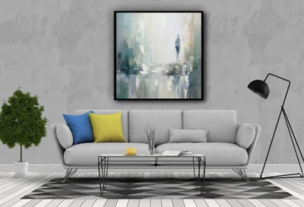 Un tableau abstrait doux et atmosphérique, représentant une silhouette solitaire dans un paysage urbain brumeux. Les tons froids de bleu,