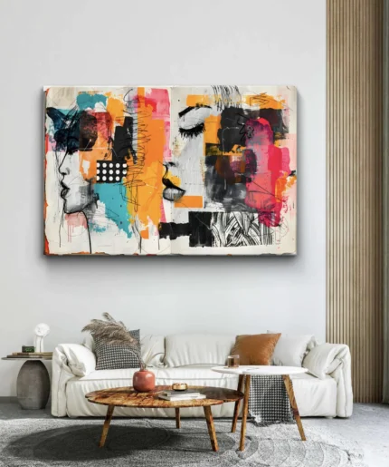 Plongez dans l’émotion et la modernité avec Visages en Fusion, une œuvre contemporaine mêlant esquisses expressives et éclats de couleurs