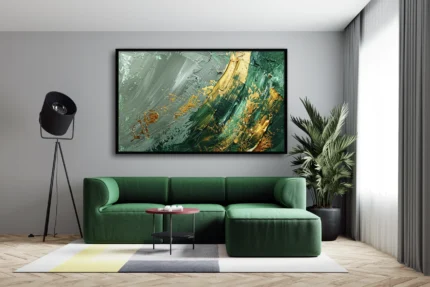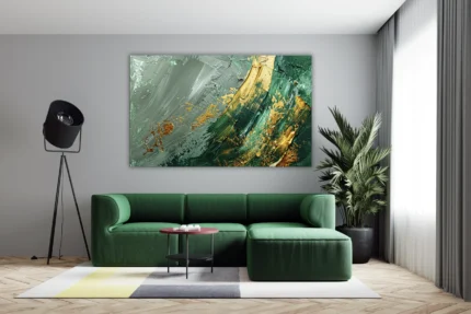 Une œuvre abstraite vibrante mêlant des teintes profondes de vert émeraude, des touches dorées métalliques et des nuances de gris