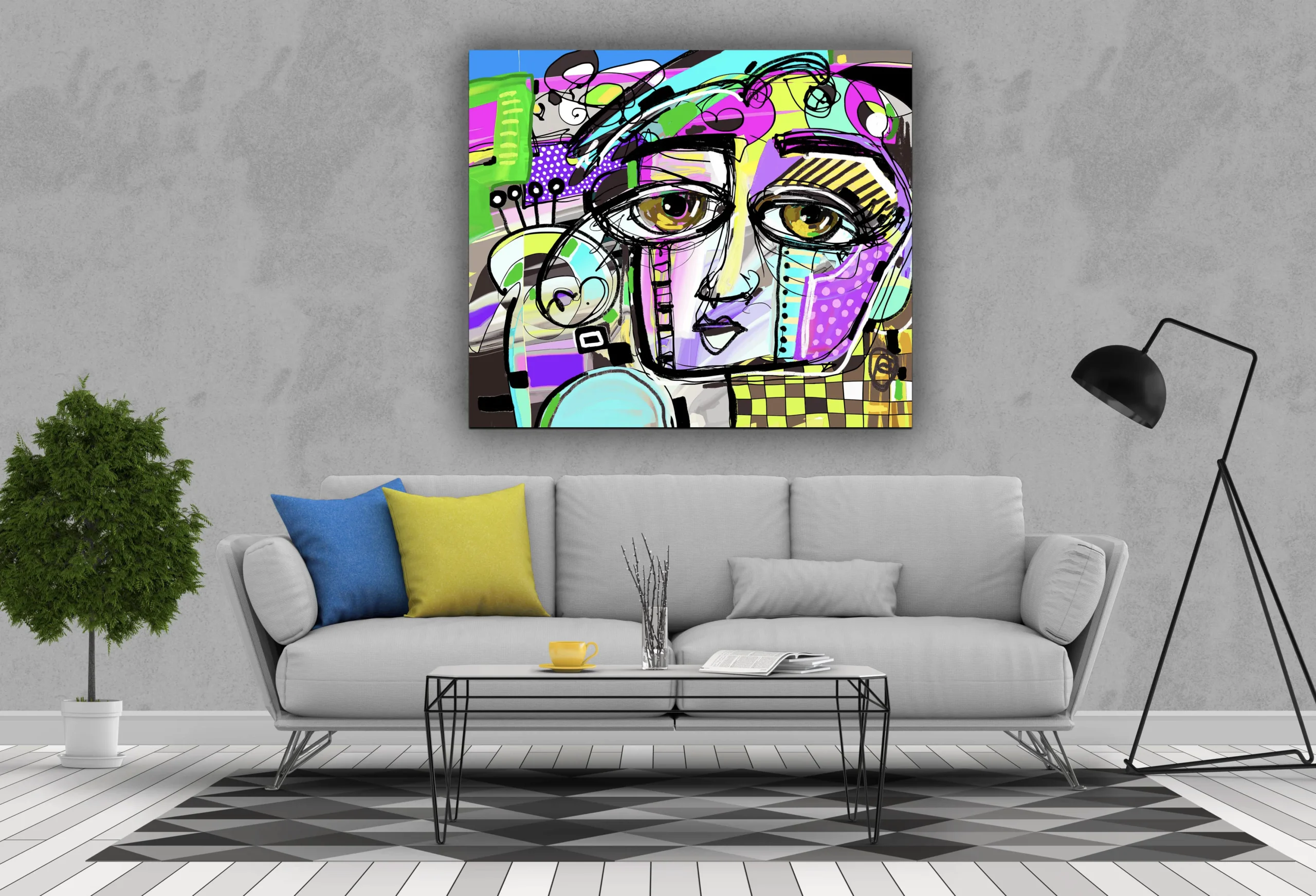 Un tableau moderne inspiré du style pop art, représentant un visage expressif aux lignes noires audacieuses et aux couleurs vives comme le vert fluo, violet, rose et jaune. Ce mélange de formes géométriques et de textures graphiques donne à l’œuvre une énergie ludique et contemporaine. Parfaite pour un intérieur jeune, créatif et plein de peps.