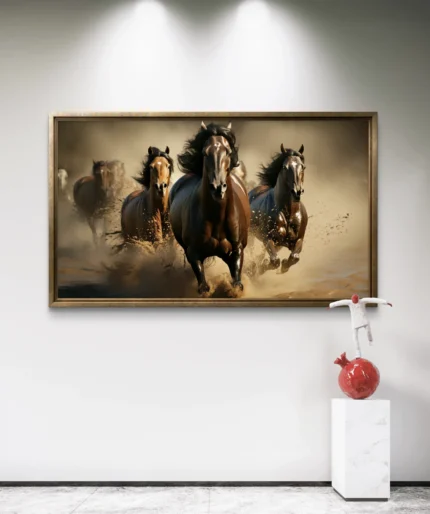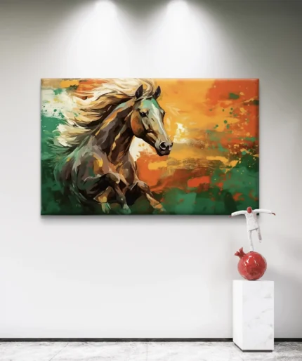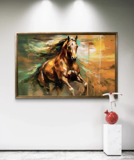 Plongez dans la puissance et la liberté avec Élan Sauvage, une œuvre d’art vibrante représentant un cheval majestueux lancé à