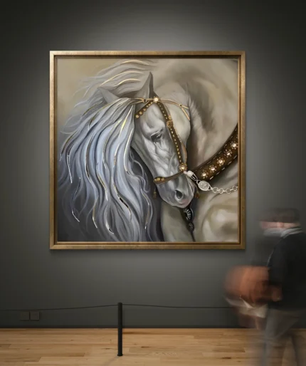 Un tableau raffiné représentant un majestueux cheval blanc orné de détails dorés et d’un harnais élégant. La douceur de ses
